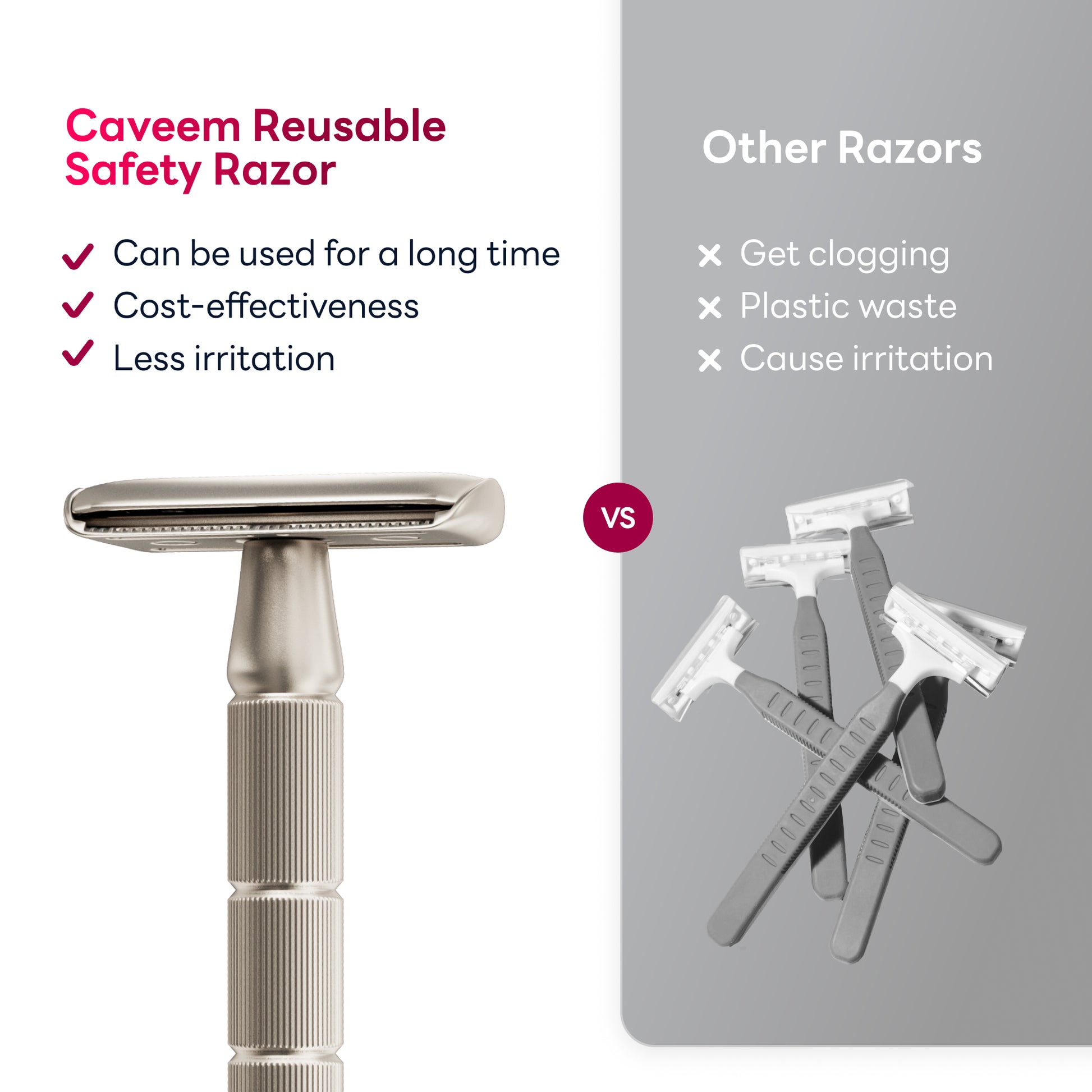 - LIGHTER PACKAGING: With a weight of 2.21 oz, CAVEEM's non-plastic razor set is portable to use. To maintain your razor for life-long use, rinse thoroughly after each use, dry completely, and store the razor in dry places for good condition